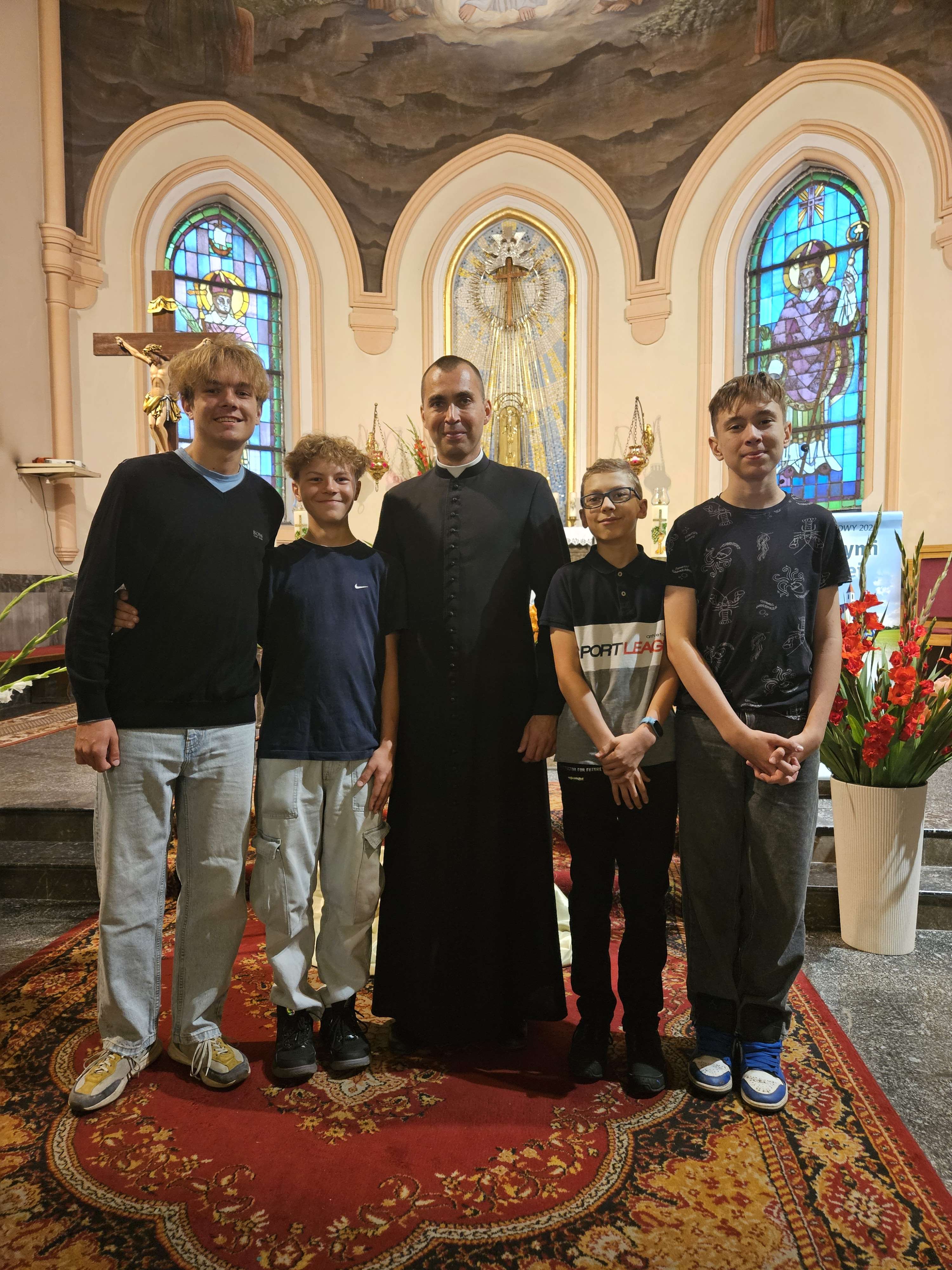 W imieniu całej naszej wspólnoty parafialnej składamy Ci najserdeczniejsze podziękowania za lata Twojej posługi duszpasterskiej w naszej Parafii. Dziękujemy Ci za odprawione Msze Święte, wygłoszone kazania i udzielone sakramenty. Bóg zapłać za każdą Eucharystię, za każdą modlitwę i za każde dobre słowo, które otrzymaliśmy od Ciebie. Dziękujemy za Twoją otwartość, uśmiech, serce, troskę o naszą parafię, zaangażowanie i wszystkie lata spędzone z nami! Na Twoją dalszą drogę życia kapłańskiego życzymy Ci obfitych łask Bożych, dużo zdrowia i sił do dalszej pracy. Niech Najświętsza Maryja Panna otacza Cię Matczyną miłością i opieką. Życzymy, abyś w nowym miejscu spotkał życzliwych ludzi i aby Twoja posługa przynosiła obfite owoce. Zapewniamy o naszej pamięci i gorącej modlitwie. Zawsze będziesz częścią historii i serca naszej parafii!